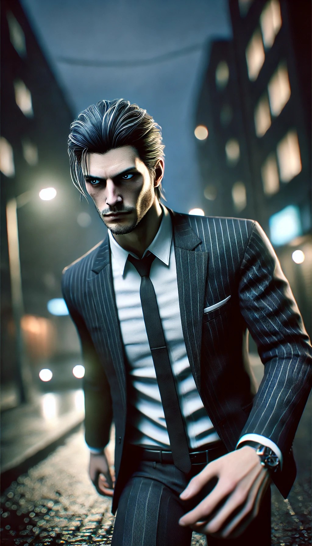 Eugene Lefkowitz is a tall, wiry fella, always lookin’ like he’s got one foot out the door. His sharp jawline’s got a permanent five o’clock shadow, and those piercing blue eyes? They don’t miss a trick. His slicked-back black hair’s startin’ to show a few streaks of gray, but that just adds to his charm—a weathered sorta look that makes dames curious and wise guys cautious. He’s always in a cheap suit, pressed so sharp it could cut you, and he’s got a knack for blendin’ into a crowd while still bein’ just noticeable enough to matter.